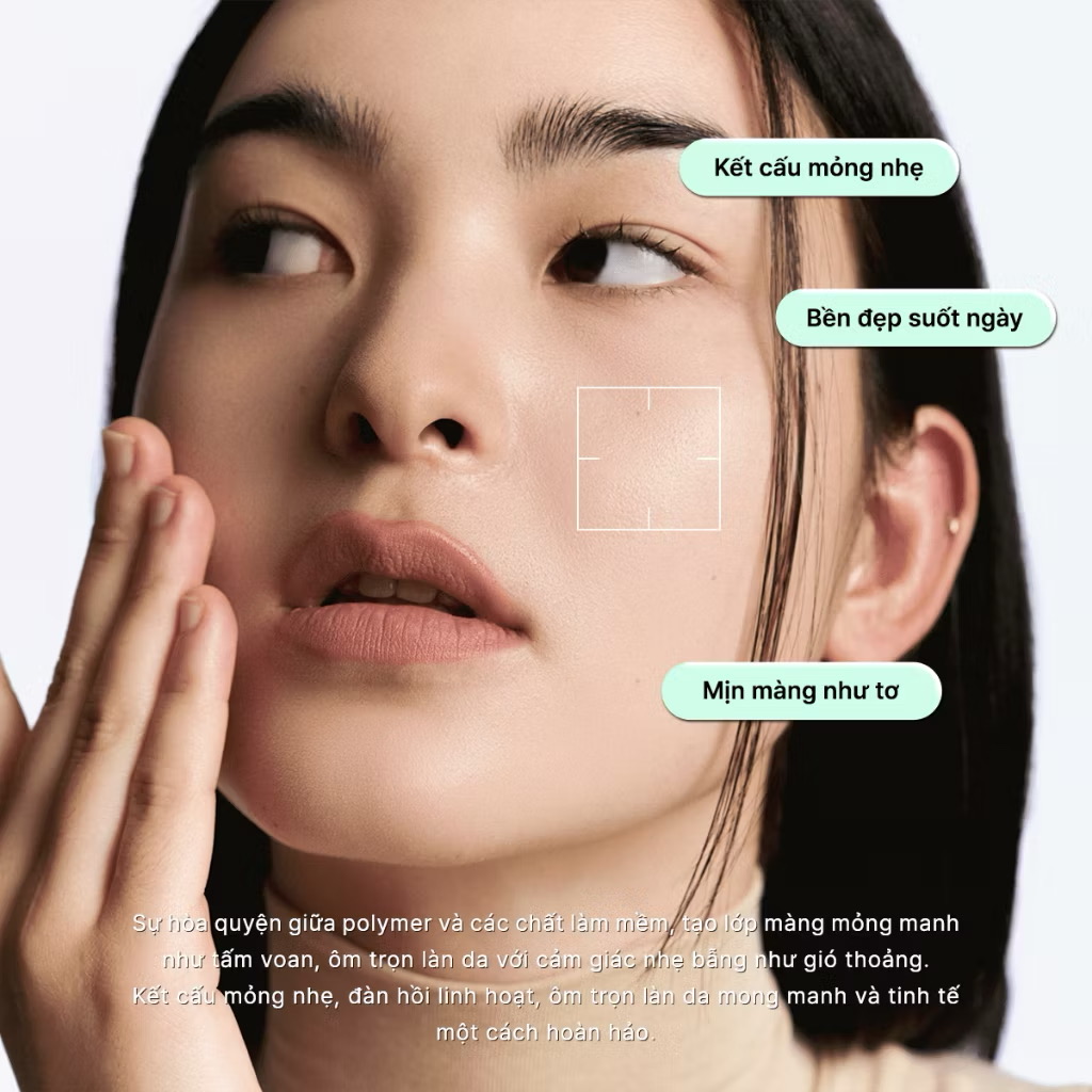 Công nghệ Organza Fit giúp lớp nền hòa quyện hoàn hảo với làn da, tạo hiệu ứng rạng rỡ, trong trẻo và sang trọng như vừa bước ra từ studio chuyên nghiệp