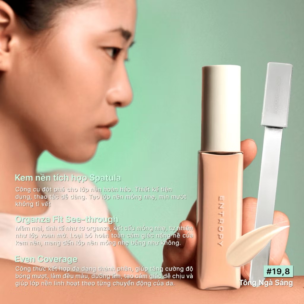 Entropy Organza Fit Spatula Foundation - kiệt tác trang điểm dành cho làn da yêu sự tinh tế. Tích hợp spatula tinh gọn chuẩn chuyên gia, mang đến trải nghiệm mượt mà, dễ dàng và chuẩn xác đến từng chi tiết, ngay tại nhà. Kết cấu mỏng nhẹ như tớ lụa, ôm sát làn da, che phủ và nâng tông tự nhiên, bền màu suốt ngày dài.