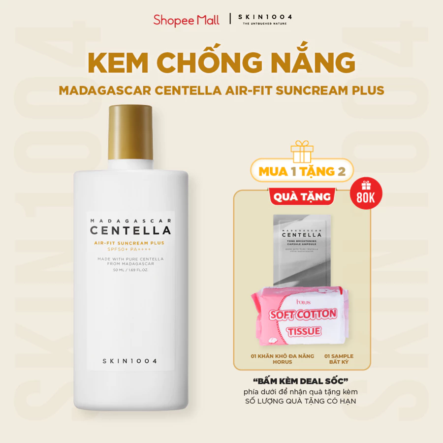 1. Giới thiệu sản phẩm: Kem Chống Nắng Lành Tính Dành Cho Da Nhạy Cảm Skin1004 Madagascar Centella Air-Fit Suncream Plus SPF50+ PA++++ 50ml với công thức chứa thêm 20% chiết xuất rau má giúp phục hồi, làm dịu, ngoài ra có chứa các thành phần từ thực vật giúp bảo vệ da khỏi tác động xấu từ môi trường. Đây là sản phẩm có thể phát huy được mọi ưu điểm và cải thiện đáng kể những nhược điểm của một loại kem chống nắng vật lý thông thường
