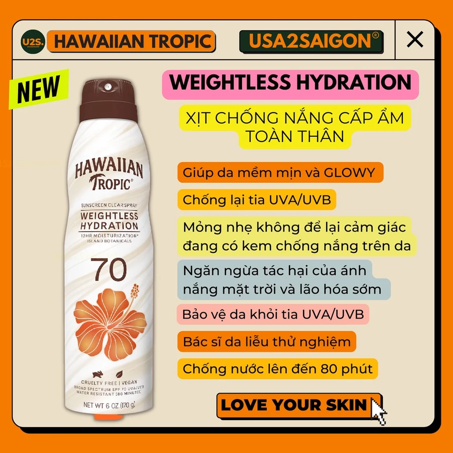 ✅Hawaiian Tropic® Silk Hydration Weightless Continuous Sunscreen Spray là một công thức nhẹ trong veo,
